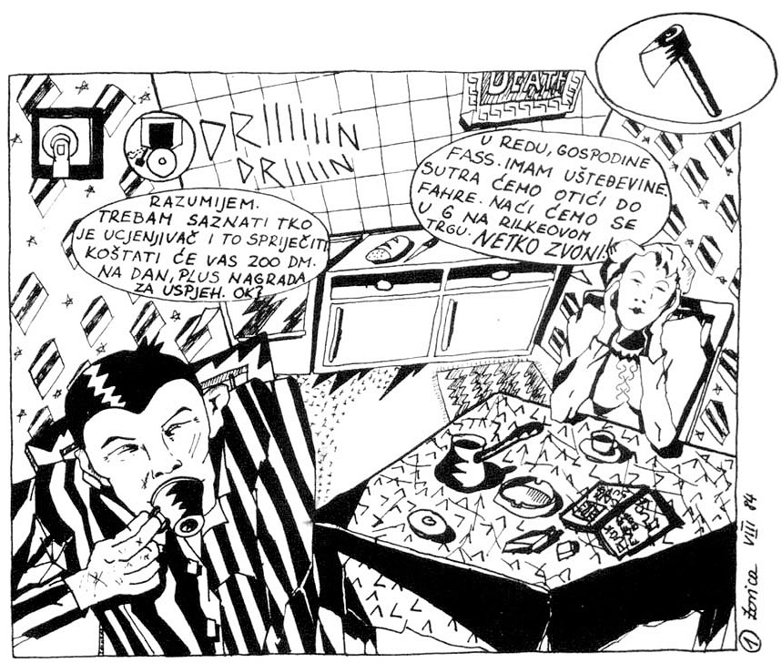 Speaking about the comics artists of the 80s, Bojan Krištofić says: “…their comics reflected the characteristic postmodern pop culture spirit of the 80s, felt mostly in the free play with different genres as narrative frameworks (crime thriller or noir was one of the most popular, followed by comic parody, and even travesty in the case of Mataković and Zorica) and in the pronounced, recognizable graphics that were often based on emphasized extremes between black and white, light and shadow, thus following, and sometimes anticipating, the experiences of some of the most prominent European and American authors.”